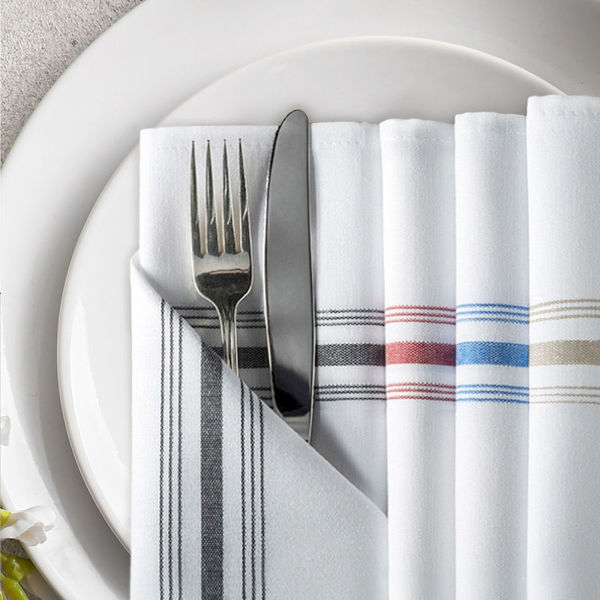 Each set comprises 1 dozen napkins, neatly packed for convenience and efficiency. With its timeless design featuring the trending classic bistro stripe pattern down each side, these napkins effortlessly blend style with functionality, enhancing the ambiance of any dining occasion.
