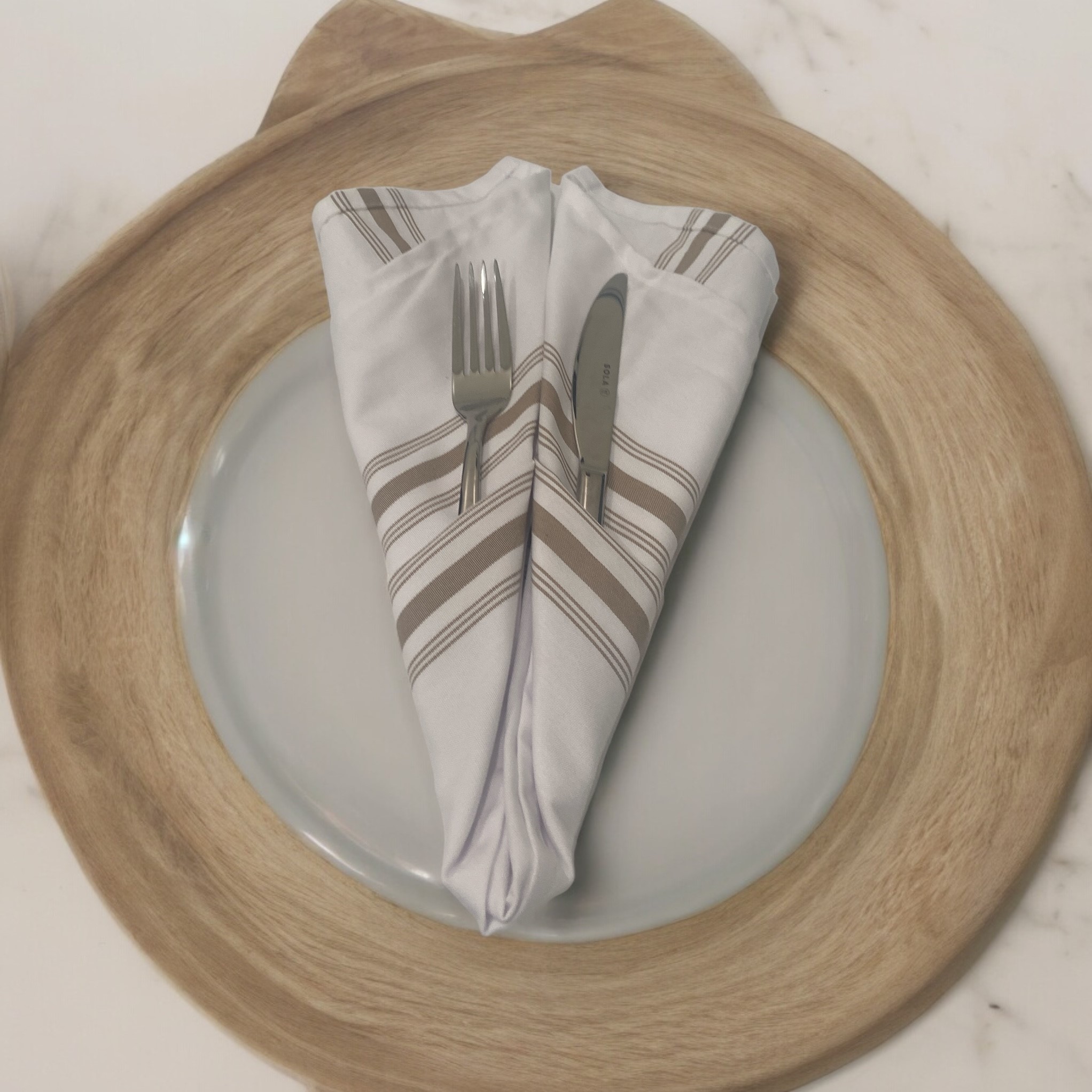 Introducing the Dinner Napkin Bistro, a sophisticated addition to any dining experience. Measuring 18″ x 22″, these pristine white napkins are adorned with elegant bamboo stripes, adding a touch of natural allure to the table setting. Crafted from 100% spun 2 ply MJS Polyester, they boast durability and softness, ensuring both practicality and comfort for diners.