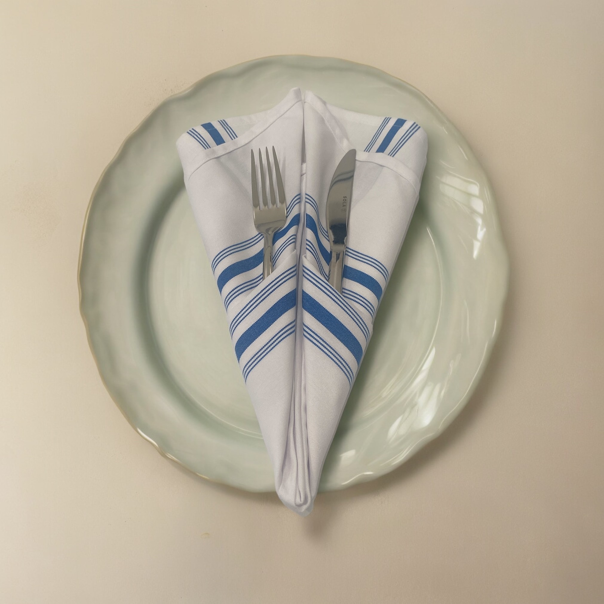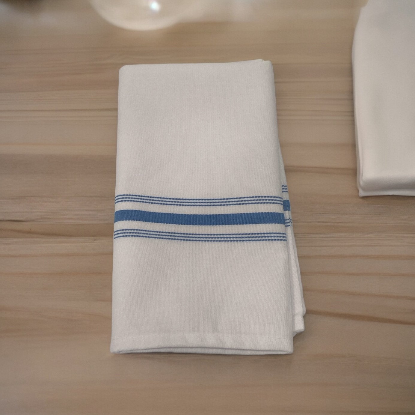 Introducing the Dinner Napkin Bistro, an essential addition to any dining experience. Crafted to perfection, each napkin measures 18″ x 22″, boasting a pristine white hue adorned with elegant blue stripes. Meticulously fashioned from 100% spun 2-ply MJS polyester, these napkins offer a luxurious touch to any table setting.