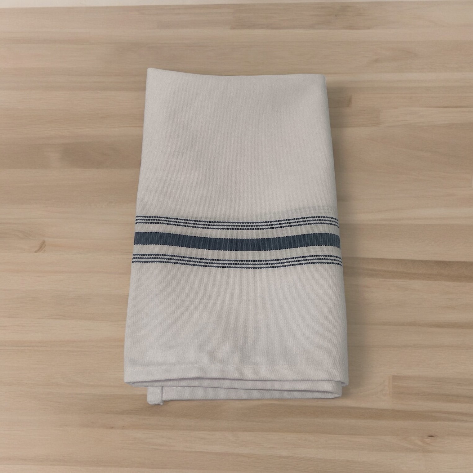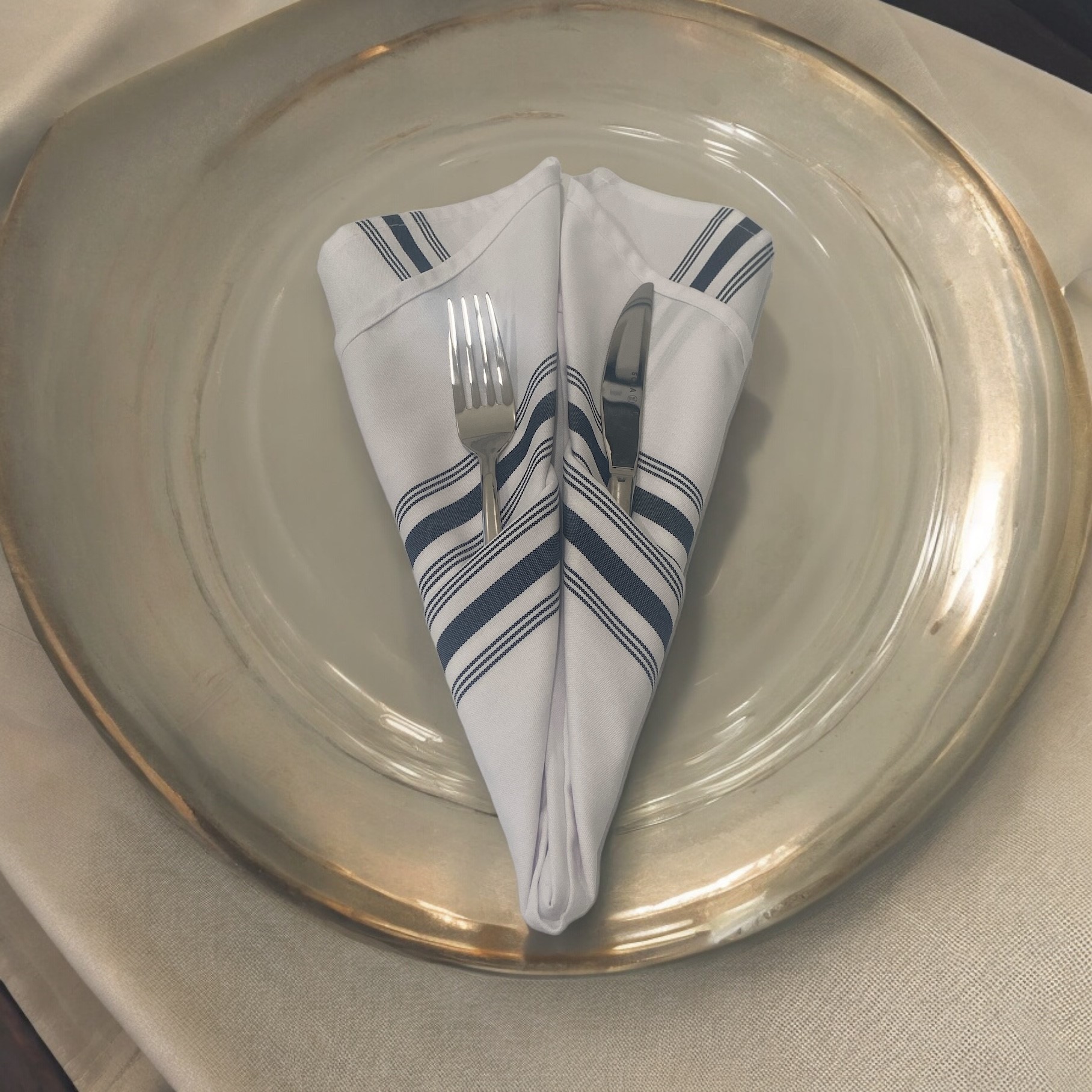 Introducing the Dinner Napkin Bistro, a charming addition to any dining setting. Measuring 18 inches by 22 inches, these napkins come in a pristine white hue adorned with sophisticated navy blue stripes, adding a touch of elegance to the table.
